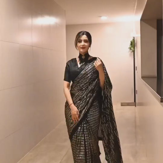 Turn heads with this stunning black georgette saree adorned with all-over sequins work, designed for women who love to dazzle in style. The lightweight fabric drapes beautifully, while the intricate sequin detailing enhances its glamorous appeal, making it perfect for parties, festive occasions, and evening events.
