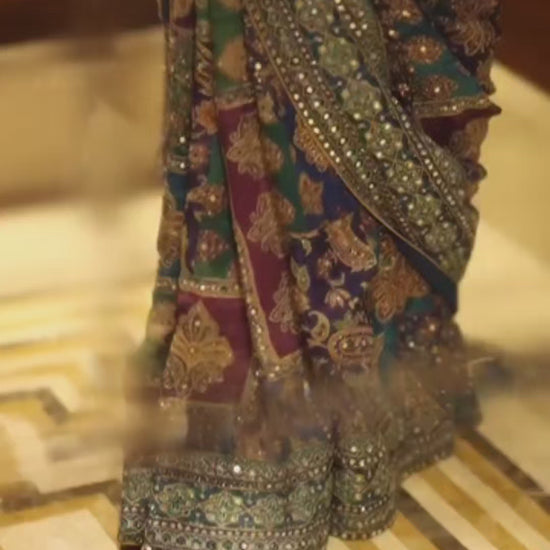 The saree is paired with a matching Chinon silk blouse piece that also carries digital prints and authentic mirror work, allowing you to style it traditionally or with a modern twist. Its lightweight yet rich drape ensures comfort while dancing through the night.