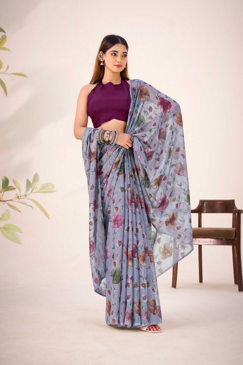 Bring together elegance and effortless charm with this Designer Floral Viscose Brasso Saree, crafted for festive moments and graceful everyday celebrations. Designed on premium Lurex Brasso fabric, the saree features delicate floral viscose brasso work that adds subtle texture, depth, and a soft shimmer to the drape.