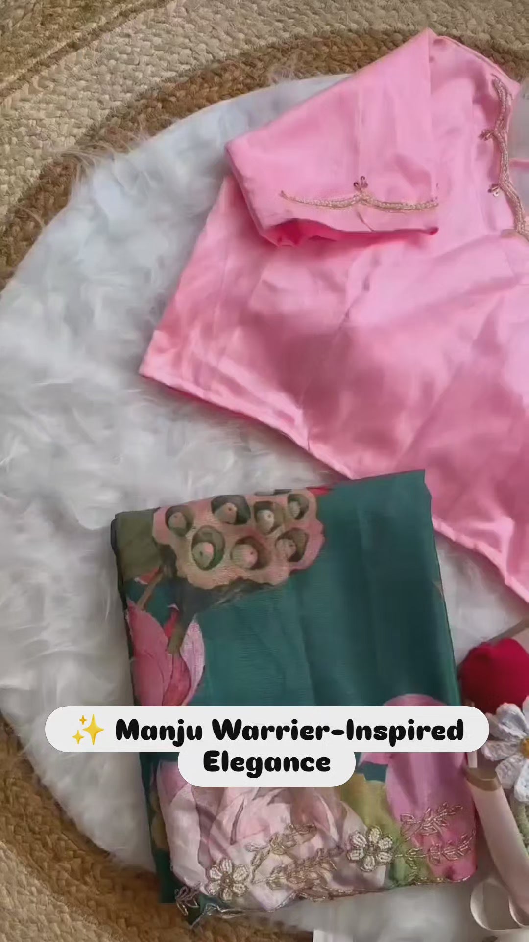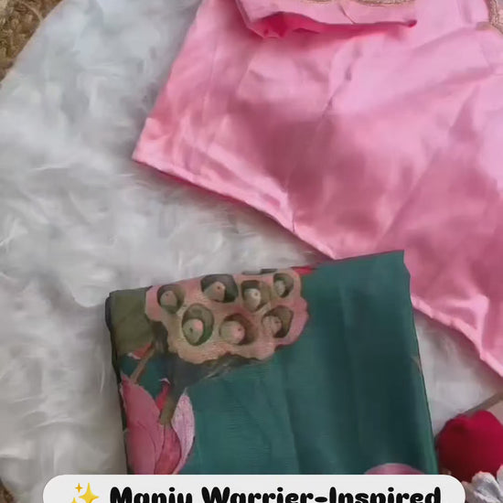 Drape yourself in grace with this Manju Warrier‑inspired soft chiffon saree, featuring an all-over digital floral print in lush greens and pinks. The saree is elegantly enhanced with hand-placed moti cut‑dana (pearls and beads) work, adding a subtle shimmer to each motif. Paired with a silky blouse adorned with matching handwork on the front and sleeves, this ensemble beautifully blends contemporary charm with traditional craftsmanship.