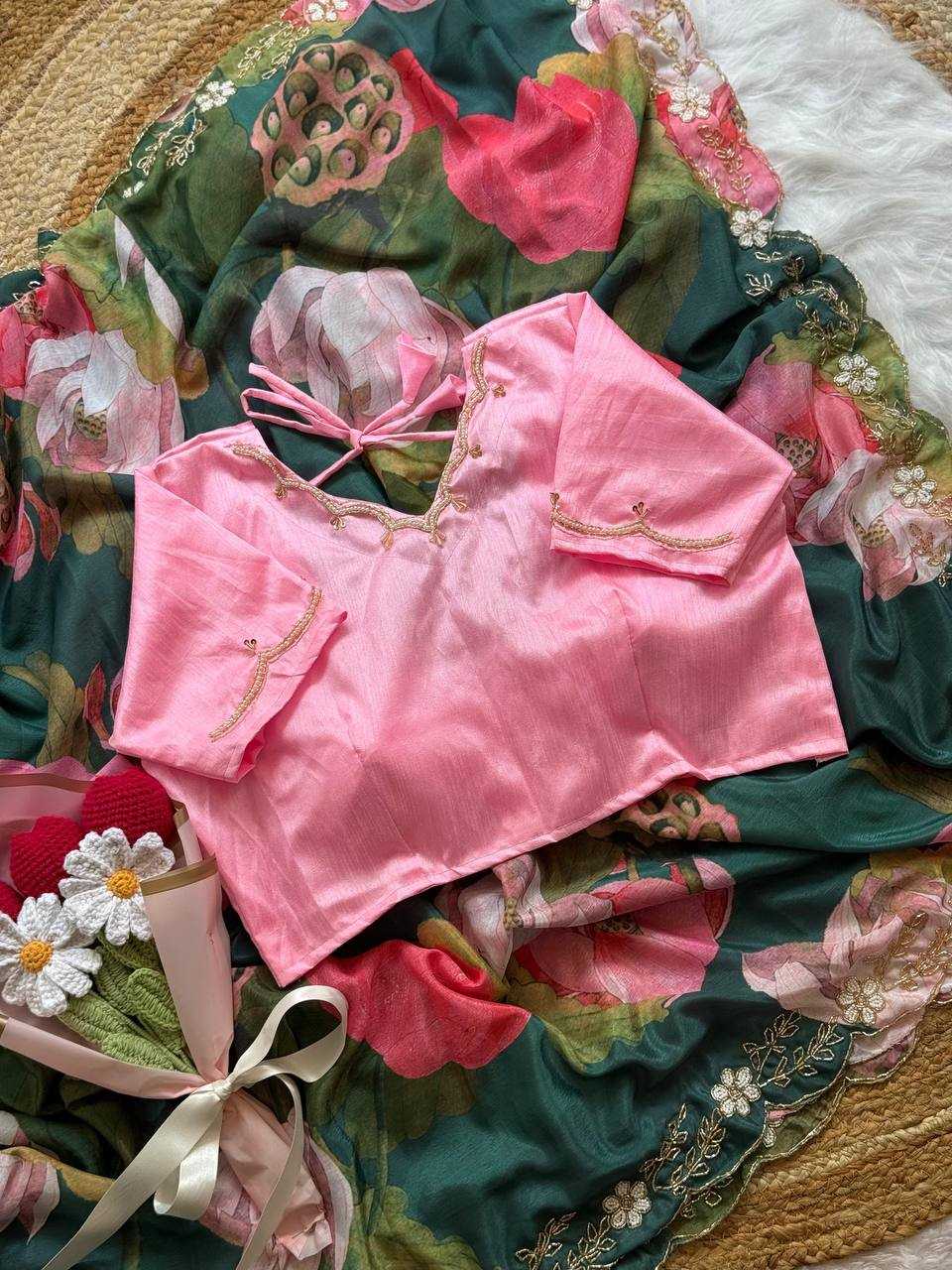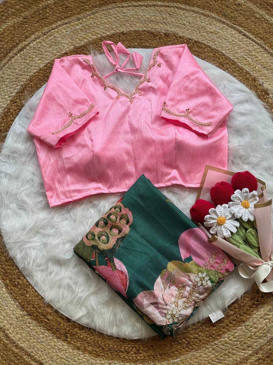 Gracefully designed and inspired by timeless elegance, this Manju Warrier–inspired designer saree is crafted from soft Chinon fabric featuring an all-over digital floral print with delicate green and pink blooms. The saree is beautifully enhanced with intricate hand-placed moti and cut-dana work on the C-pallu, adding a refined festive shimmer. Paired with a mono Banglori silk blouse adorned with coordinated handwork, this saree offers a perfect balance of tradition and contemporary charm—ideal for weddings, celebrations, and evening occasions.