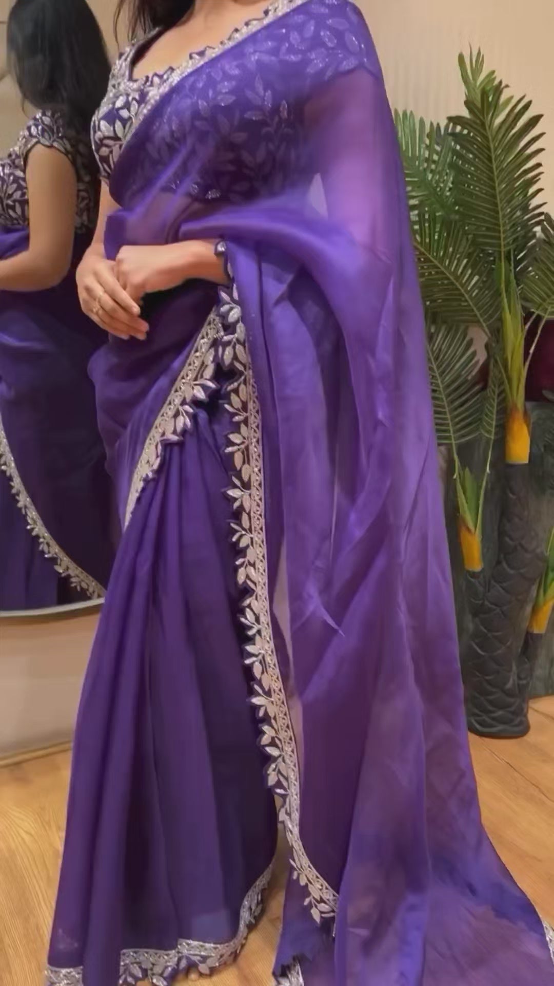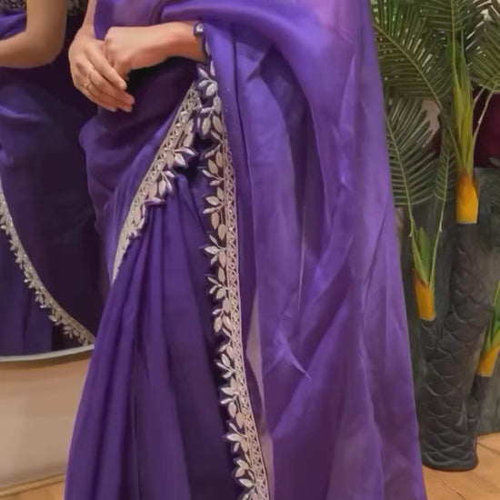 To complete the ensemble, it comes with a fully stitched blouse in matching purple, featuring all-over embroidery work on the body and sleeves with a convenient side zip. Designed in sizes 38–46, the blouse is ready-to-wear, saving you the hassle of tailoring.