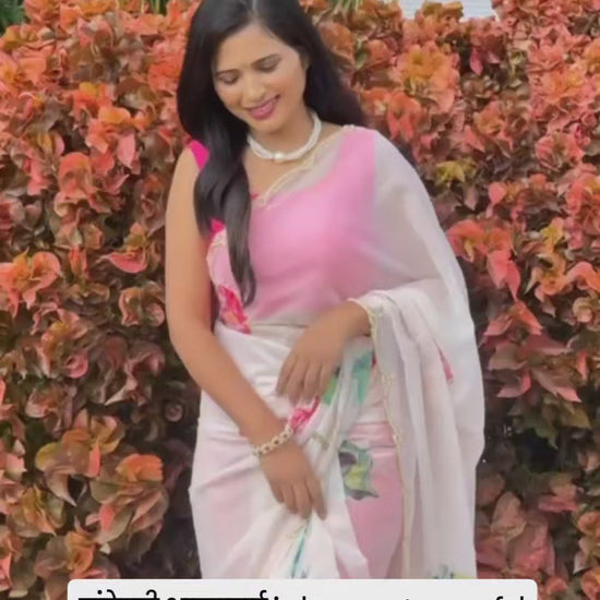 This luxurious Soft Mulmul Organza Silk Saree is a celebration of delicate craftsmanship and understated beauty. Adorned with printed lotus motifs, each bloom is hand-highlighted using intricate cut-dana, sitara, pearl, and zari work. The saree’s elegant scallop hand-embroidered border adds grace and texture to its fluid form.