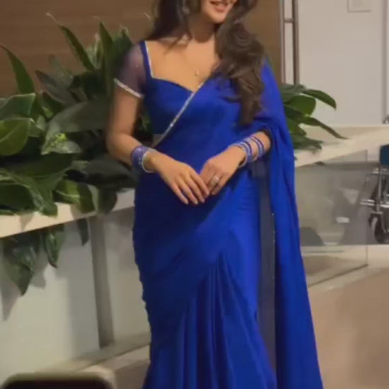 Step into elegance with the Sreeleela Blue Georgette Saree, a timeless drape that perfectly balances simplicity with glamour. Crafted in soft faux georgette, this saree flows effortlessly, making it an ideal choice for both casual outings and festive occasions.