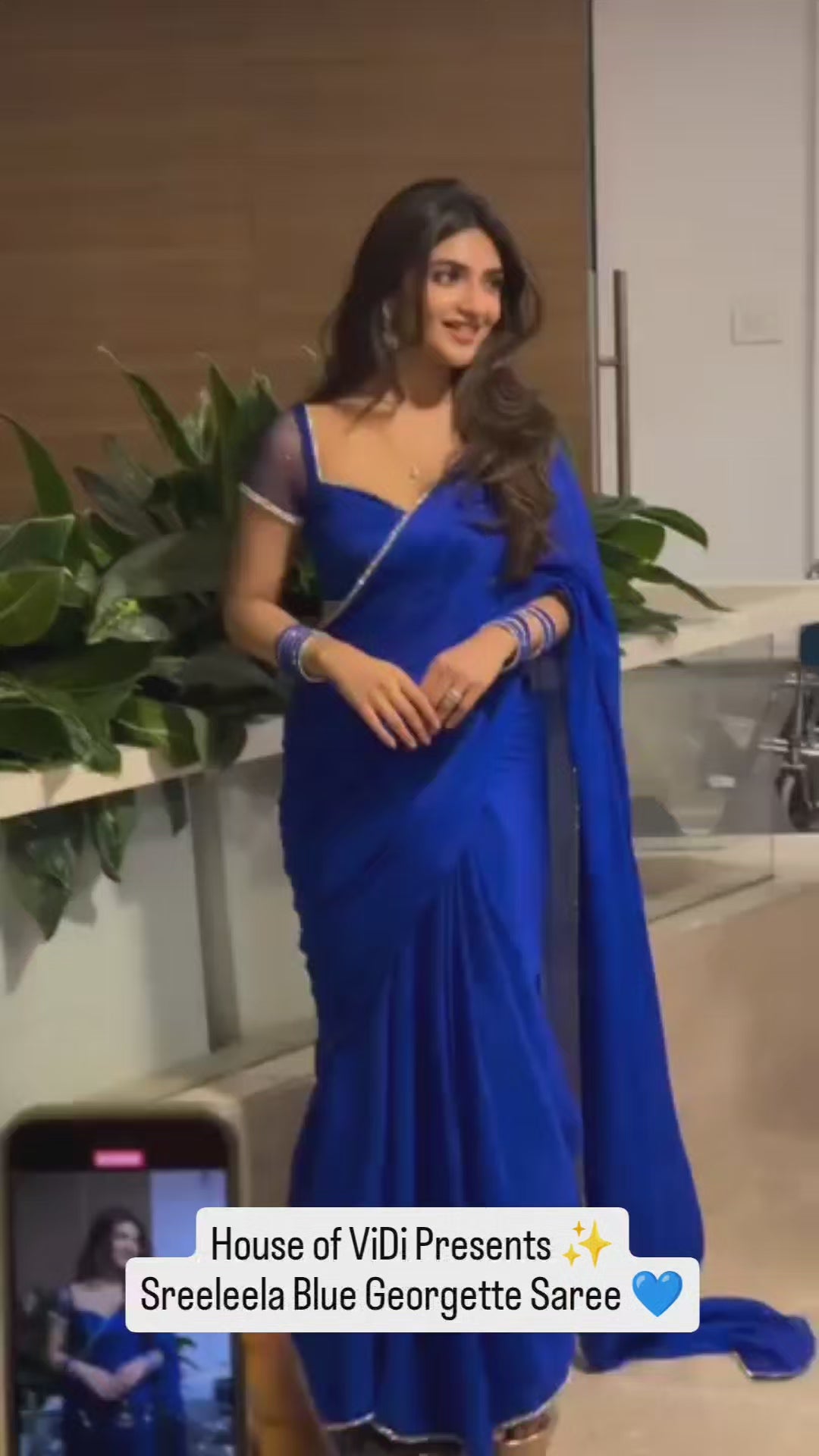 Sreeleela Blue Georgette Saree – Elegant Faux Georgette Blumming Saree with Matching Blouse